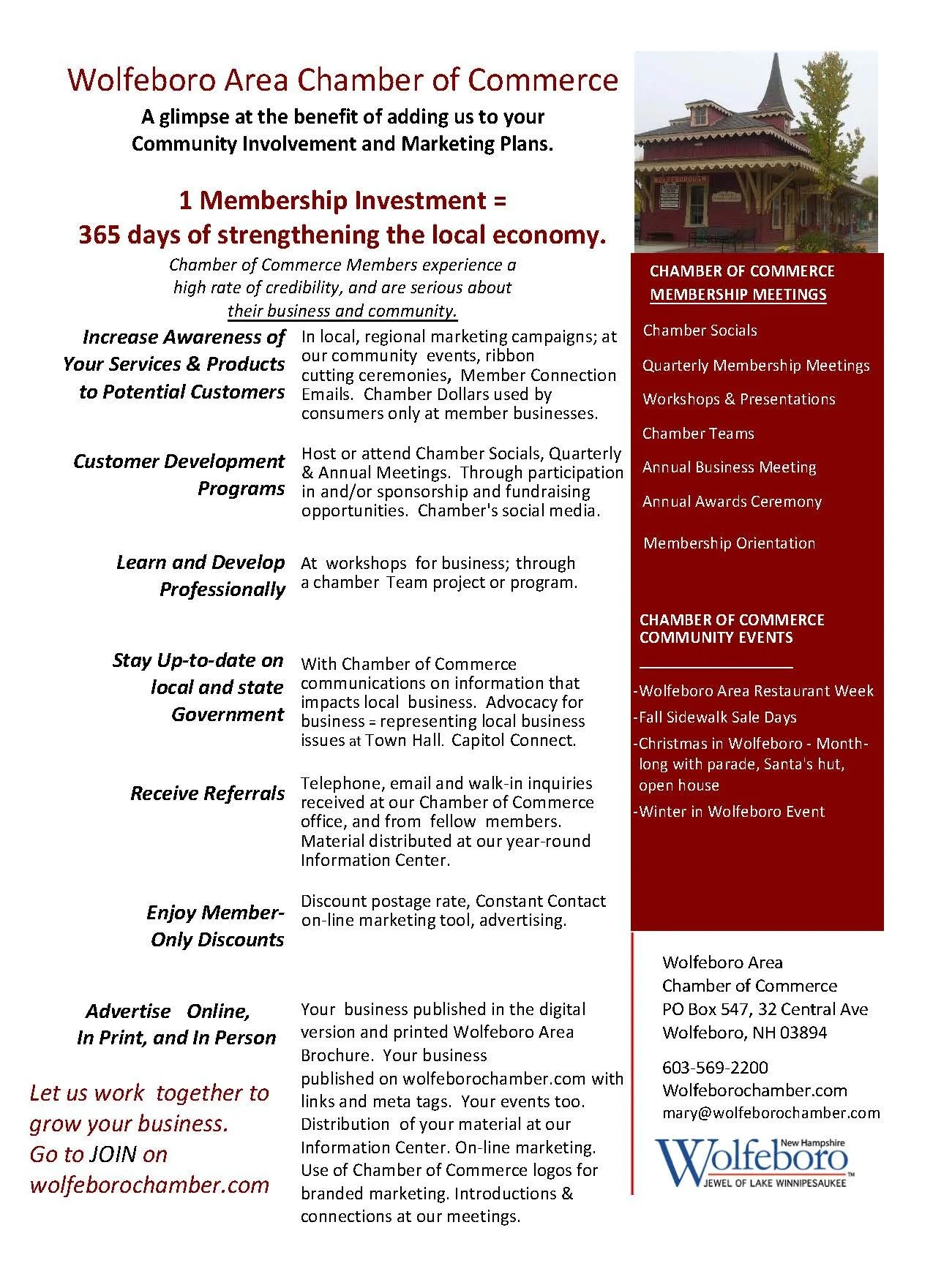 Give us a call 603-569-2200 or send your email to assistant@wolfeborochamber.com